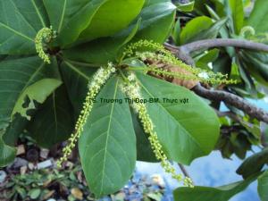 Cây gỗ nhỏ [hình 1] cao 10-15 m mọc đứng, tiết diện tròn; thân già màu nâu đậm xù xì; thân non màu xanh có những nốt sần màu nâu xám và lông mịn màu nâu đỏ ở ngọn cành. Lá [hình 2] đơn, nguyên, mọc cách tập trung nhiều ở ngọn cành [hình 3]; phiến lá hình trứng ngược gốc thuôn hình chót buồm, dài 15-25 cm, rộng 9-13 cm, màu xanh mặt trên đậm hơn ở mặt dưới, có 2 nốt sần [hình 4] tròn ở đáy phiến cạnh hai bên gân chính. Gân lá hình lông chim nổi rõ ở cả 2 mặt, 9-11 cặp gân phụ kéo dài tận bìa lá; lông màu nâu đỏ rải rác ở mặt dưới của gân chính. Cuống lá hình trụ gần tròn dài 1-1,7 cm, có nhiều lông mịn màu nâu đỏ và lông cứng thẳng đứng màu đen ở nơi đính của lá. Không có lá kèm. Cụm hoa [hình 5] gié dài thòng ở nách lá gần ngọn cành hay ở ngọn cành, gié mang hoa lưỡng tính [hình 6] ở khoảng 1/5 phía gốc và hoa đực [hình 7] do bầu noãn bị trụy ở ngọn hoặc gié mang toàn hoa đực. Hoa [hình 8] đều, mẫu 5, lưỡng tính hoặc đơn tính đực. Đài hoa: 5 lá đài đều, màu trắng xanh, dính bên dưới thành ống ngắn bên trên chia 5 thùy hình tam giác, nhiều lông mịn màu trắng dài 0,5-1 mm ở mặt trong, tiền khai van. Không có cánh hoa. Bộ nhị: 10 nhị [hình 9] đều, rời, đính thành 2 vòng trên họng đài, vòng ngoài xen kẽ với lá đài; chỉ nhị dạng sợi dài 3-4 mm, màu trắng; bao phấn màu vàng, 2 ô, hình bầu dục có hai thùy, nứt dọc, hướng trong; hạt phấn [hình 10] màu vàng hơi xanh, hình bầu dục 2 đầu rộng có nhiều rãnh, dài 27,5 µm rộng 10 µm. Bộ nhụy: Bầu [hình 11] dưới màu xanh, dài 1,5-2 mm, mặt ngoài có nhiều lông trắng mịn; 1 lá noãn, 1 ô, 1 noãn [hình 12] đính nóc; 1 vòi nhụy màu vàng, dạng sợi hơi phình ở gốc dài khoảng 4 mm; đầu nhụy hình điểm. Quả [hình 13] hạch, quả non hình bầu dục đầu nhọn màu xanh, khi chín quả gần tròn màu vàng, vỏ quả sần sùi, dài 4-6 cm, rộng 3-4 cm. Hạt [hình 14] hình bầu dục dài 2-2,5 cm, màu vàng nhạt có lớp vỏ áo mỏng dễ bóc.