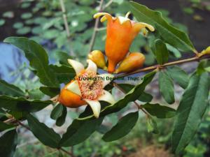 Cây gỗ nhỏ [hình 1] cao từ 2-4 m, thân già màu xám có tiết diện tròn, thân non màu xám hơi đỏ, tiết diện vuông có 4 cánh. Thân có ít gai [hình 2] và thường ngọn cành biến đổi thành gai. Lá [hình 3] đơn mọc đối, phiến lá nguyên hình thuôn dài, ngọn lá nhọn, gốc lá hình chót buồm, dài 6-7 cm, rộng 1,3-1,6 cm, mép lá hơi uốn lượn, hai mặt lá nhẵn màu xanh, mặt trên bóng hơn mặt dưới. Gân lá hình lông chim, gân chính nổi rõ mặt dưới, 7 cặp gân phụ nối với nhau ở gần mép lá, màu đỏ, chìm. Cuống lá màu đỏ, hình lòng máng có cánh ở 2 bên, dài 0,5-0,7 cm. Không có lá kèm. Cụm hoa [hình 4]: hoa có thể mọc riêng lẻ hoặc tụ lại thành xim ít hoa ở nách lá hay ở ngọn cành. Hoa [hình 5] to màu đỏ, đều, lưỡng tính; cuống hoa không có hoặc rất ngắn, dài 0,1- 0,4 cm, tiết diện vuông, màu xanh loang đỏ; trên cuống của hoa riêng lẻ có những vẩy màu xanh mọc đối; ở cụm hoa xim, hoa có lá bắc và 2 lá bắc con [hình 6] hình vảy tam giác, dài 0,5-1 mm, màu xanh. Đế hoa lõm [hình 7] hình chuông, dài 2,5-3 cm, rộng 1,5-2 cm, màu đỏ. Bao hoa [hình 8] đính trên miệng đế hoa, 6-8 lá đài [hình 9] hình tam giác nhọn rời, đều, màu đỏ, dày và cứng cao 1-1,2 cm, rộng 0,8-1 cm, tồn tại trên quả, tiền khai van; 6-8 cánh hoa [hình 10] màu đỏ, mỏng, rời, móng ngắn phiến rộng gần tròn hơi khum, nhăn, nhàu nát trong nụ dài 1,5-2 cm, rộng 1-1,2 cm, tiền khai van. Bộ nhị [hình 11]: nhiều nhị, rời, gần đều, xếp thành nhiều vòng ở mặt trong đế hoa; chỉ nhị [hình 12] màu đỏ dạng sợi mảnh dài 0,6- 0,8 cm, cong trong nụ dựng đứng lên khi hoa nở; bao phấn màu vàng thuôn dài 0,1-0,15 cm, 2 ô, nứt dọc, hướng trong, đính giữa [hình 13]; hạt phấn [hình 14] hình bầu dục có rãnh dọc, rời, màu vàng, dài 27,5 m, rộng 16,25 µm. Bộ nhụy [hình 15]: 8-10 lá noãn, bầu dưới, dính liền với đế hoa, xếp thành 2 tầng, tầng dưới 2-3 ô đính noãn trung trụ, tầng trên 6-7 đính noãn bên, ô mỗi ô nhiều noãn [hình 16]; 1 vòi nhụy màu vàng hình trụ tròn, dài 0,5-0,8 cm; một đầu nhụy [hình 17] màu xanh nhạt, phẳng. Quả [hình 18] mọng to có vỏ cứng, mang đài còn lại, quả hình cầu đường kính 8-10 cm, màu xanh loang đỏ, nhiều hạt [hình 19]. Hạt [hình 20] hình khối đa giác đường kính từ 0,5- 0,7 cm, màu trắng hơi hồng hoặc màu hồng, vỏ ngoài của hạt mọng nước, có thể ăn được.