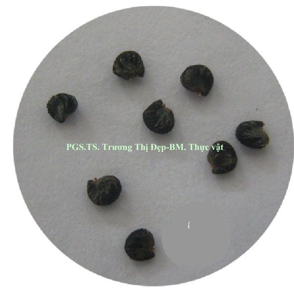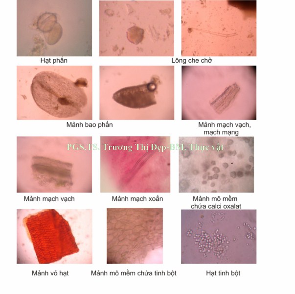 Bột hoa, quả: Màu nâu, ít xơ. Các thành phần có trong bột: Hạt phấn hình cầu có 3 lỗ nảy mầm hay hình bầu dục có rãnh, lông che chở đơn bào, mảnh bao phấn, mảnh mạch mạng, mạch vạch, mạch xoắn; mảnh mô mềm chứa tinh thể calci oxalat hình cầu gai, mảnh vỏ hạt màu đỏ cam, mảnh mô mềm chứa nhiều tinh bột; hạt tinh bột tập trung thành đám hay tách rời nhau, hình cầu hay bầu dục, có góc, kích thước 2,5 µm, tễ không rõ.