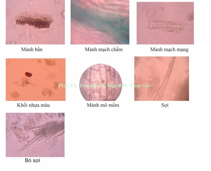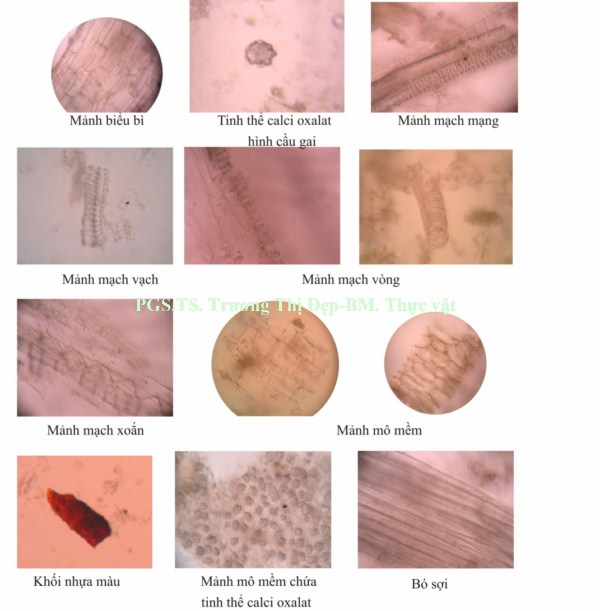 [inline:=Bột lá]: Màu xanh nâu, mịn. Các thành phần có trong bột: Tinh thể calci oxalat hình cầu gai, mảnh mạch mạng, mạch vạch, mạch xoắn; mảnh mô mềm, khối nhựa màu nâu đỏ; hạt tinh bột ít, kích thước không đều, hình cầu, tễ ở tâm hình sao; mảnh biểu bì mang lỗ khí kiểu song bào.