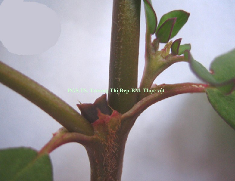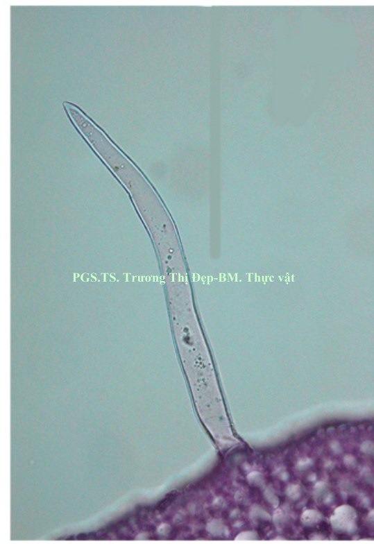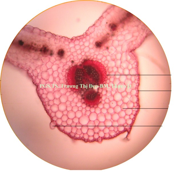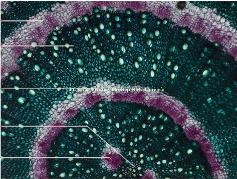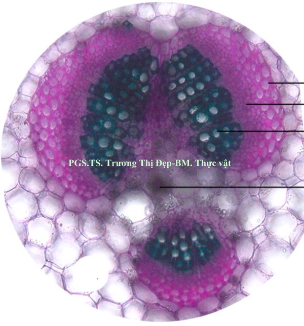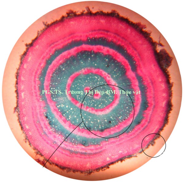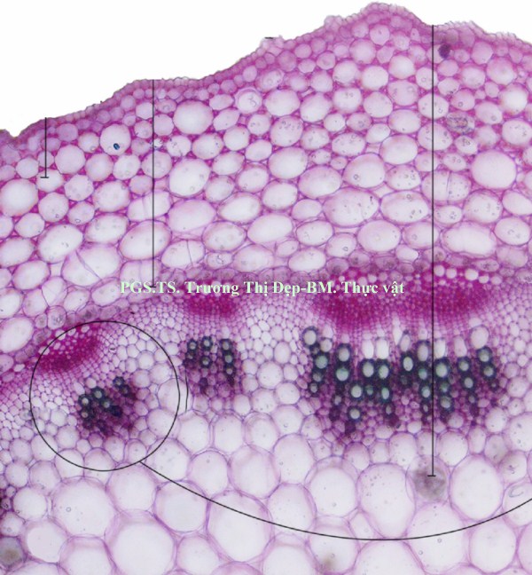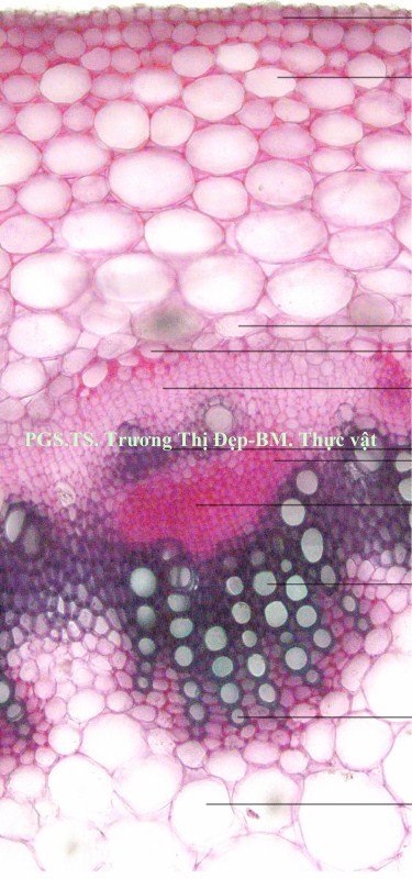 Thân: Vi phẫu thân tròn, tế bào biểu bì hình chữ nhật có kích thước không đều. Lớp cutin mỏng, có răng cưa. Trên biểu bì có lỗ khí và lông che chở đơn bào. Dưới lớp biểu bì là mô dày góc, hình đa giác hay bầu dục, kích thước không đều. Mô mềm vỏ hình bầu dục, kích thước không đều, xếp chừa khuyết nhỏ, chứa tinh bột và tinh thể calci oxalat hình cầu gai. Nội bì chứa nhiều tinh bột, khung Caspary không rõ. Trụ bì trước bó dẫn là những tế bào hình đa giác có vách dày bằng cellulose. Libe 1 tập trung thành từng đám. Ở thân non, các bó libe gỗ cấp 2 không đều, bị gián đoạn bởi tia tủy gồm nhiều dãy tế bào, mô mềm gỗ 2 có vách bằng cellulose. Mạch gỗ 2 có kích thước đều. Ở thân già, sự hoạt động của tượng tầng phụ ở vùng trụ bì tạo thành các bó libe gỗ cấp 3. Mô mềm tủy gồm nhiều tế bào bầu dục to, không đều, xếp lộn xộn, chừa những khuyết nhỏ, chứa nhiều tinh bột, tinh thể calci oxalat hình cầu gai, đường kính 37,5-50 µm.
