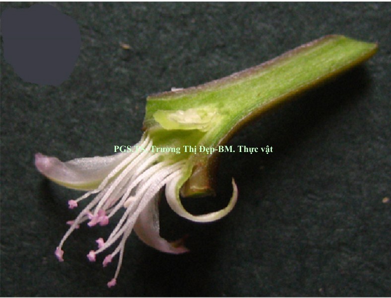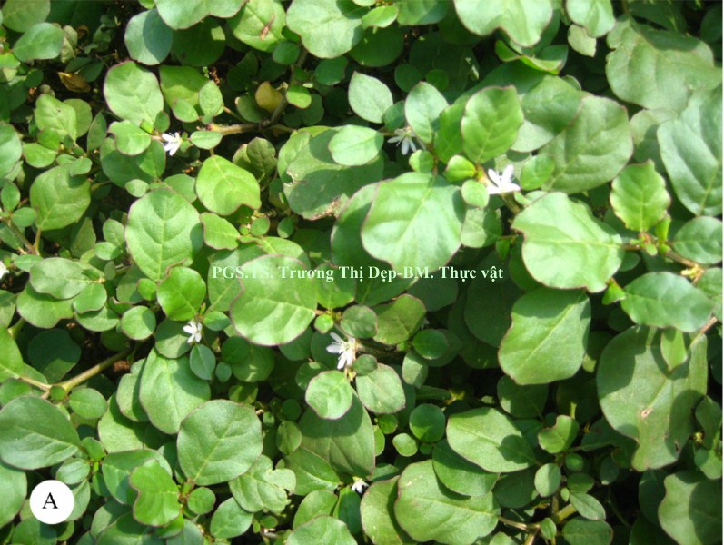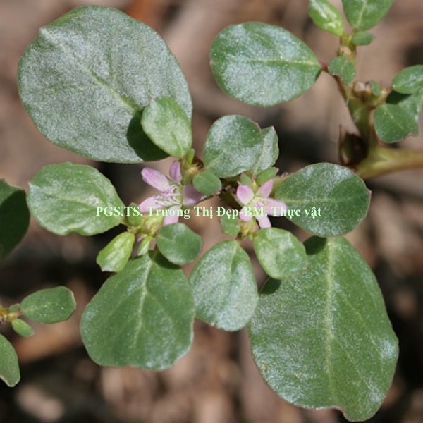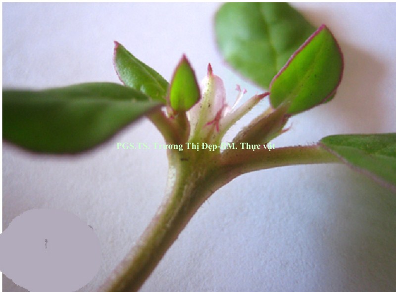 Thân cỏ mọng nước, mọc sà trên mặt đất, tiết diện tròn. Thân non có nhiều lông, màu đỏ tía ở phần hướng sáng, phần còn lại màu xanh. Thân già sần sùi, màu đỏ tía. Thân phát triển theo kiểu hợp trục. Lá đơn, mọc đối, mập, có vị hơi đắng. Ở mỗi mấu thân có một lá to (dài 3,5-5,2 cm, rộng 3,0-4,8 cm) và một lá nhỏ (dài 2-2,6 cm, rộng 1,5-2 cm). Phiến lá hình xoan, gốc lá hơi thuôn, đầu lá tù. Bìa phiến lá có đường viền màu đỏ tím uốn lượn, có răng cưa cạn không đều. Lá có màu xanh đậm ở mặt trên, màu xanh nhạt ở mặt dưới. Gân lá hình lông chim, 4-5 cặp gân phụ. Cuống lá hình lòng máng, dài 0,5-1,5 cm, màu xanh hơi đỏ tía, nhiều lông. Bẹ lá ôm thân, dài 0,5 cm, bìa là màng mỏng màu trắng, có vảy màu đỏ tía ở hai bên nơi tiếp giáp với cuống. Cụm hoa: Hoa đơn độc ở nách lá, không có cuống. Hoa đều lưỡng tính, mẫu 5, không có cánh hoa. 2 lá bắc con hình tam giác, dài khoảng 0,5 cm, màu xanh nhạt, đỉnh màu đỏ tía, nhiều lông. Lá đài 5, đều, dính nhau thành ống đài chôn trong nách lá. 5 phiến màu trắng hay hồng nhạt, thuôn dài (dài 5 cm, rộng 2 cm), đỉnh tròn. Mặt dưới lá đài có một gân xanh, nhiều lông, kéo dài thành mũi nhọn màu đỏ tía tách rời khỏi lá đài, tiền khai 5 điểm. Bộ nhị: 15-20 nhị không đều. Nhị dính trên ống đài. Nhị rời, chỉ nhị dạng sợi mảnh, màu trắng. Bao phấn màu tím nhạt, 2 ô, hướng trong, đính giữa. Hạt phấn hình bầu dục, màu trắng, rời, có rãnh, dài 60 µm, rộng 35 µm. Bộ nhụy: 1 lá noãn tạo bầu trên 1 ô, chôn trong nách lá. Nhiều noãn đính bên. 1 vòi nhụy ngắn, màu xanh nhạt. Đầu nhụy hình điểm. Quả khô, đầu bằng, nứt ngang, có 8 hạt. Hạt màu đen, hình thận, có mấu nhọn.