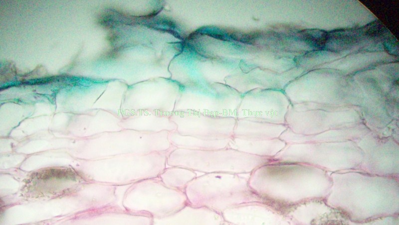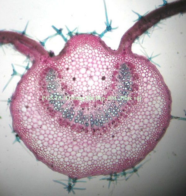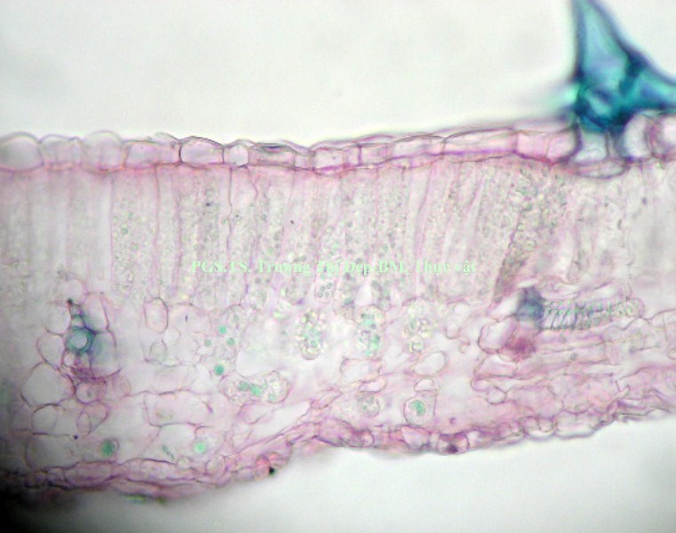 Từ ngoài vào trong gồm các mô: Biểu bì với lớp cutin mỏng và có răng cưa nhỏ, rải rác có lỗ khí. Lông che chở và lông tiết có nhiều ở biểu bì trên, rất ít ở biểu bì dưới, hình dạng và cấu tạo tương tự như ở thân. Hạ bì liên tục dưới biểu bì trên, gián đoạn ở biểu bì dưới, là 1-2 lớp tế bào nhỏ hơn tế bào mô dày, hình tròn hay hơi đa giác, xếp chừa những khuyết nhỏ. Mô dày góc gồm 1-4 lớp tế bào. Mô mềm gồm những tế bào không đều, vách mỏng, giữa các tế bào có đạo nhỏ; vài tế bào chứa rất nhiều tinh thể calci oxalat dạng cát. Libe gỗ ở giữa xếp thành một hình cung liên tục hay chia thành 3 cụm, gỗ xếp ở trên và libe ở dưới; ở hai góc có thêm 2 bó libe gỗ nhỏ. Li be quanh tủy là những cụm nhỏ phía trên gỗ. Vi phẫu lá Gân giữa lồi ít ở mặt trên, lồi nhiều ở mặt dưới, gồm các mô sau: Biểu bì trên và biểu bì dưới có lớp cutin mỏng và phẳng hoặc có răng cưa nhỏ, đôi khi có lỗ khí. Lông che chở và lông tiết có nhiều trên cả 2 lớp biểu bì, cấu tạo tương tự như ở thân. Hạ bì liên tục dưới biểu bì trên, gián đoạn ở biểu bì dưới, là 1-2 lớp tế bào nhỏ hơn tế bào mô dày, hình tròn hay hơi đa giác, xếp chừa những khuyết nhỏ. Mô dày góc gồm 1-2 lớp tế bào. Mô mềm gồm những tế bào không đều, hình đa giác, vách mỏng, giữa các tế bào có đạo nhỏ; vài tế bào chứa rất nhiều tinh thể calci oxalat dạng cát. Libe và gỗ xếp thành hình vòng cung ở giữa, gỗ xếp ở trên và libe ở dưới. Libe quanh tủy là những cụm nhỏ ở phía trên gỗ cấp 1. Phiến lá: Tế bào biểu bì trên to hơn tế bào biểu bì dưới. Lông che chở và lông tiết ít gặp, hình dạng và cấu tạo tương tự như ở thân nhưng đa số là dạng lông che chở có chân ngắn. Lỗ khí kiểu dị bào rất nhiều ở biểu bì dưới. Thịt lá có cấu tạo dị thể không đối xứng, mô giậu là một lớp tế bào thuôn dài, mô xốp gồm những tế bào không đều, một vài tế bào chứa đầy tinh thể calci oxalat dạng cát, rải rác có những bó libe gỗ của gân phụ.