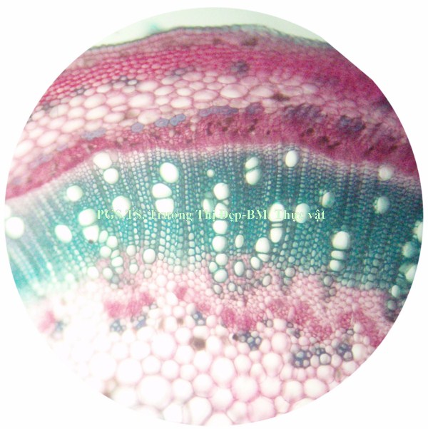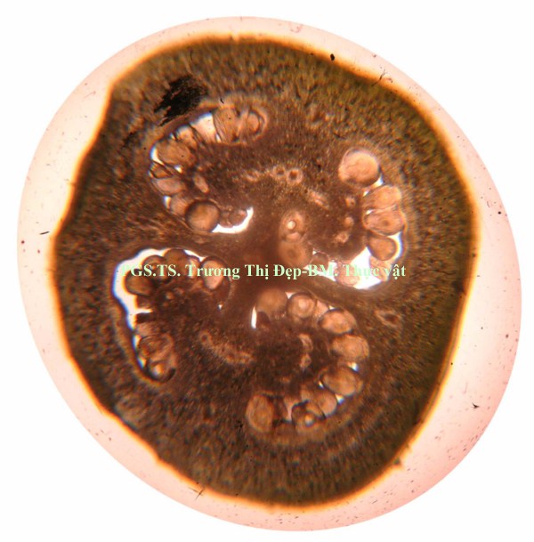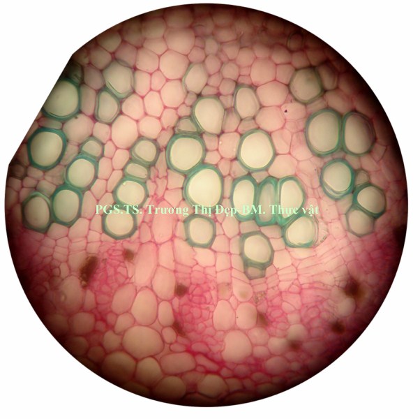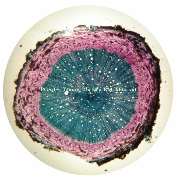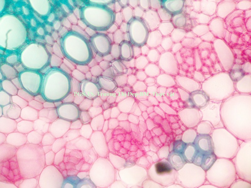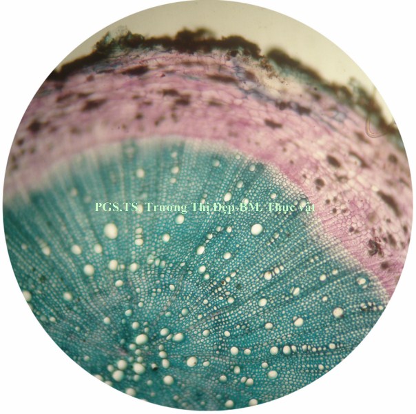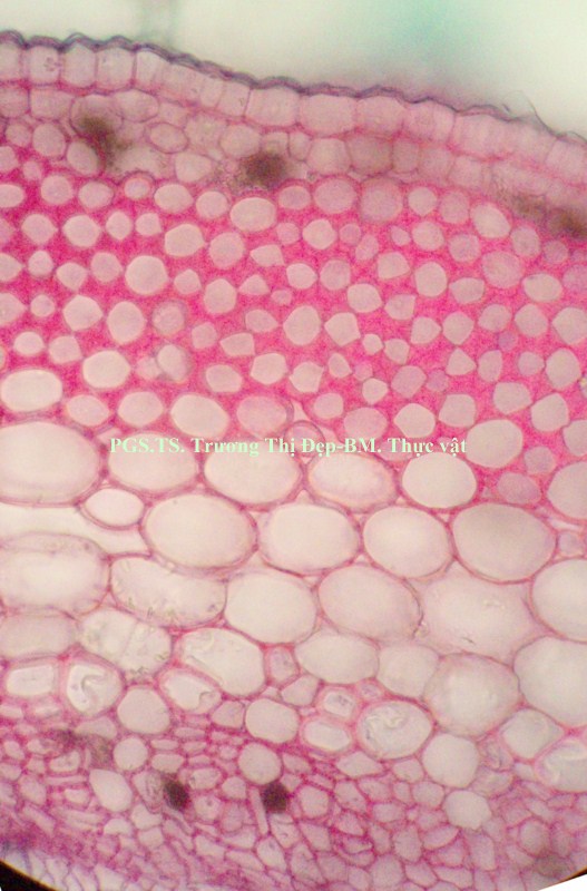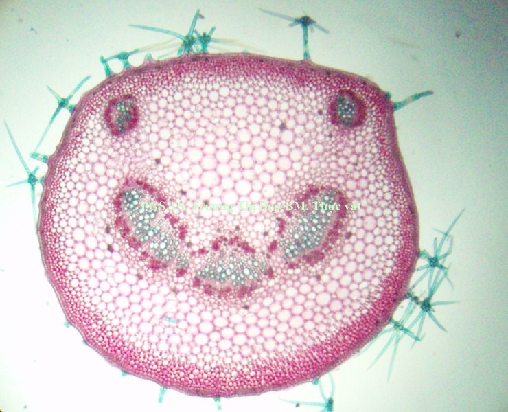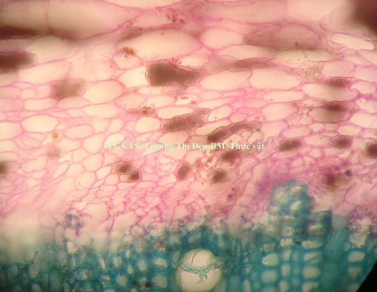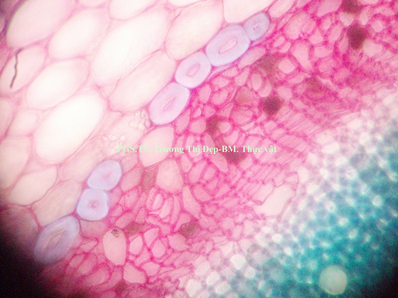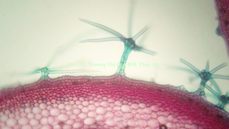 Vi phẫu rễ hình tròn, tâm có khi bị lệch. Từ ngoài vào trong gồm các mô: Bần thường gồm 2-4 (có khi hơn) lớp tế bào vách mỏng, hình chữ nhật dẹp theo hướng tiếp tuyến; các lớp phía ngoài thường bị rách tua tủa. Mô mềm vỏ gồm 2-3 lớp tế bào không đều, hình bầu dục dẹp theo hướng tiếp tuyến, không đều, vách mỏng; giữa các tế bào có đạo hay khuyết nhỏ; nhiều tế bào chứa đầy tinh thể calci oxalat dạng cát. Nội bì khung Caspary ít rõ. Tế bào mô cứng rải rác, vách mỏng hay dày với ống trao đổi rõ. Libe tạo thành vòng quanh gỗ, nhiều tế bào chứa đầy tinh thể calci oxalat dạng cát. Gỗ 2 chiếm tâm; mạch gỗ rất nhiều, rải rác khắp cùng; mô mềm gỗ là những tế bào vách mỏng; tia ruột rõ, hẹp, gồm 1-2 dãy tế bào. Gỗ 1 không phân biệt được hay xếp thành bó ngay dưới tia ruột, mỗi bó có 3-4 mạch phân hóa hướng tâm. Vi phẫu thân hình gần tròn hay bầu dục, thân non nhiều lông che chở, thân già ít hay không có lông. Từ ngoài vào trong gồm các mô: Biểu bì là những tế bào gần như vuông hay chữ nhật, lớp cutin mỏng và phẳng, rải rác có lỗ khí, mang lông che chở và lông tiết. Lông che chở đa bào gồm chân và đầu; chân lông ngắn hay dài, gồm 4- nhiều tế bào không đều, xếp thành 2 hay 3 hàng dọc; đầu lông gồm nhiều tế bào không đều xếp tỏa thành hình sao; vách các tế bào ở chân dày hơn vách tế bào ở đầu. Lông tiết rải rác khắp biểu bì, đi từ một tế bào biểu bì, gồm chân và đầu; chân lông là 1 tế bào, có thể ngắn hay dài hơn đầu; đầu lông tròn, thường cong gặp xuống, gồm 1 tế bào ở dưới và 3-4 tế bào ở trên xếp trên cùng một mặt phẳng. Vùng vỏ: Hạ bì gồm 1, ít khi 2 lớp tế bào có kích thước tương tự hay hơi to hơn tế bào mô dày, hình tròn hay hơi đa giác, xếp chừa những khuyết nhỏ, nhiều tế bào chứa đầy tinh thể calci oxalat dạng cát. Mô dày góc gồm 5-6 lớp tế bào không đều, hình đa giác; một số tế bào phía trong hóa mô cứng thành từng cụm rải rác. Mô mềm vỏ gồm 4-5 lớp tế bào không đều, hình bầu dục dẹp theo hướng tiếp tuyến, vách mỏng, xếp chừa những đạo nhỏ; một số tế bào có chứa rất nhiều tinh thể calci oxalat dạng cát. Sợi hay tế bào mô cứng xếp thành từng cụm. Libe xếp vòng bao quanh gỗ, nhiều tế bào chứa đầy tinh thể calci oxalat dạng cát. Gỗ cấp 2 liên tục thành vòng; mạch gỗ to, không đều, tập trung thành từng vùng; mô mềm gỗ là những tế bào có vách mỏng; tia ruột nhiều và rõ, gồm 1-2 dãy tế bào. Mạch gỗ cấp 1 rời rạc hay xếp thành bó phân hóa ly tâm, thường tập trung theo các mạch gỗ cấp 2. Libe trong là những cụm nhỏ, phía dưới gỗ cấp 1, phía dưới có thêm những tế bào hóa mô cứng. Mô mềm ruột gồm những tế bào to, không đều, hình đa giác, vách mỏng, xếp chừa những đạo nhỏ; một vài tế bào có chứa rất nhiều tinh thể calci oxalat dạng cát. Cuống lá