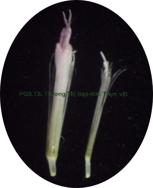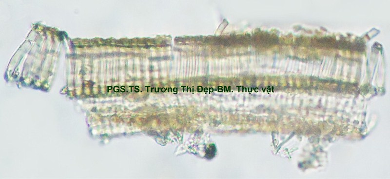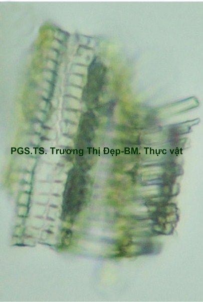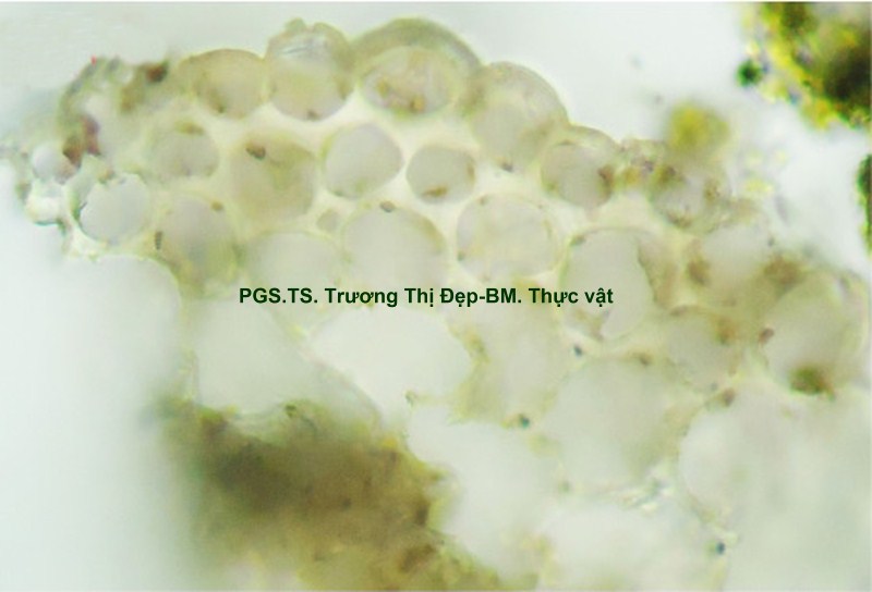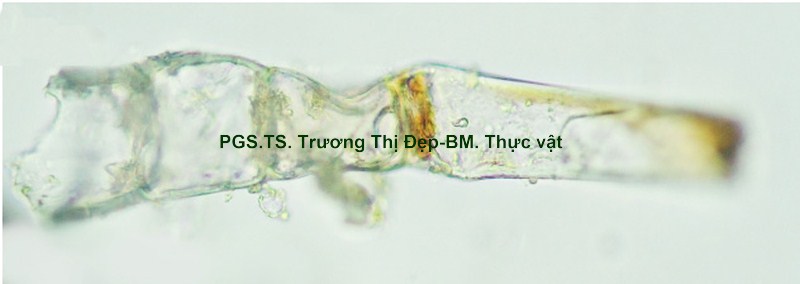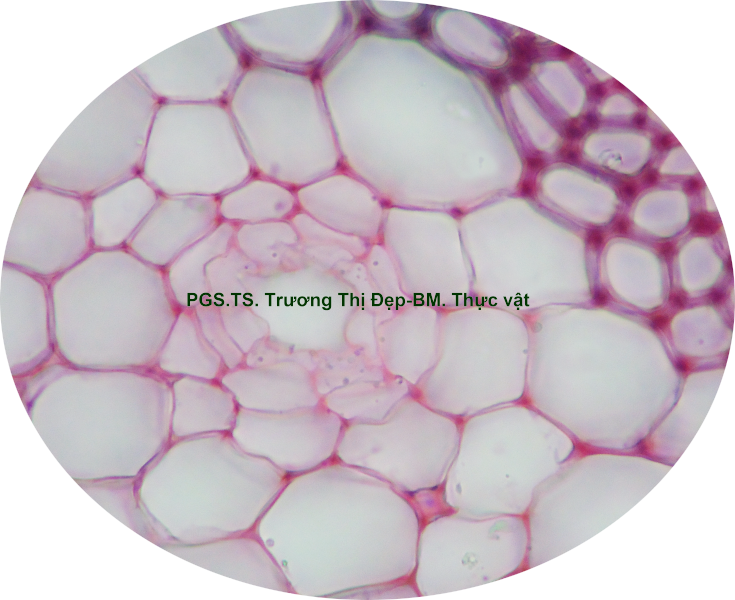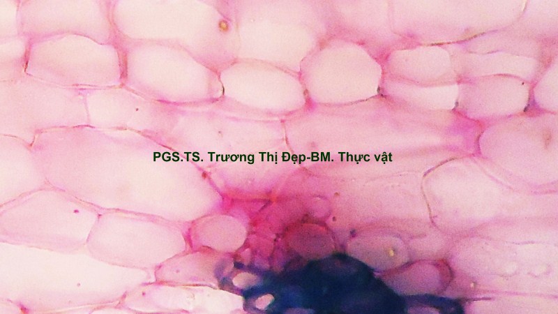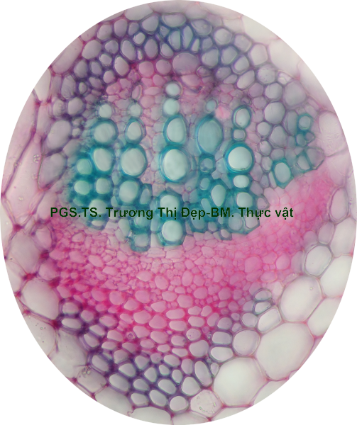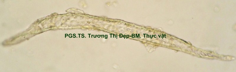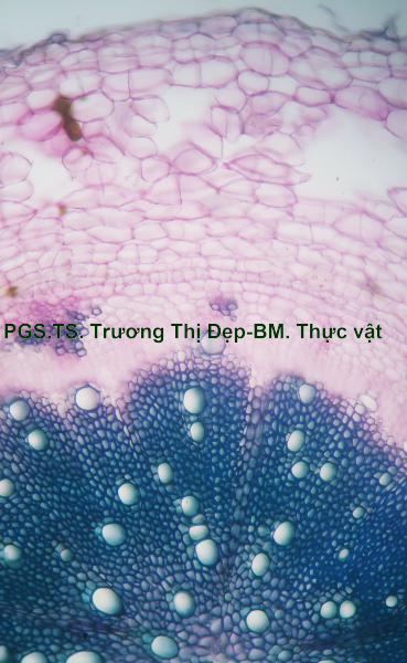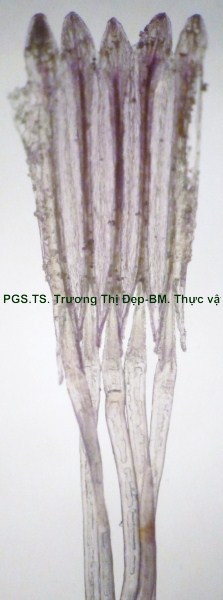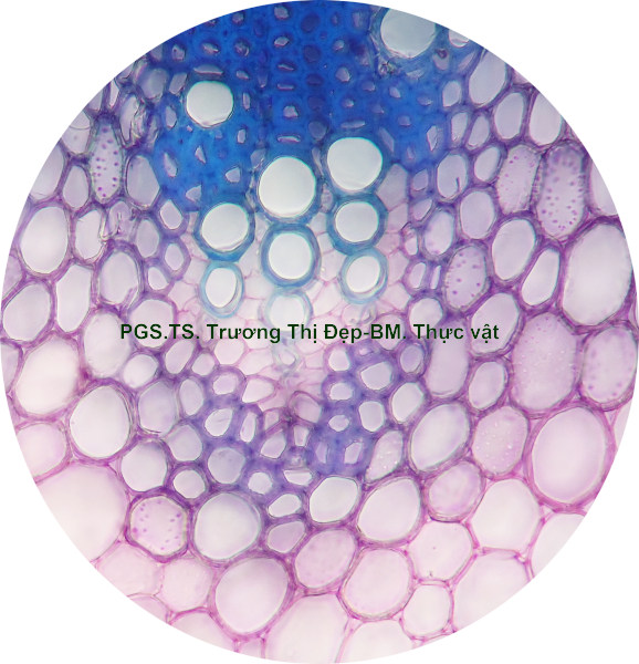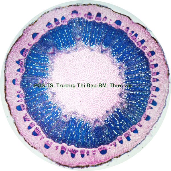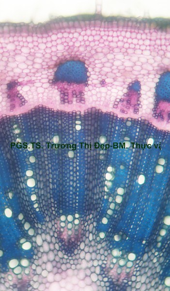 Vi phẫu thân non hình đa giác, thân già hình gần tròn. Các mô gồm: Biểu bì một lớp tế bào hình chữ nhật hay gần tròn, kích thước nhỏ, gần đều, lớp cutin có răng cưa cạn. Trên biểu bì rải rác có lỗ khí, nhiều lông che chở đa bào và lông tiết đa bào. Lông che chở đa bào phía trên một dãy 2-5 tế bào dài và dẹp có vách rất mỏng, gần gốc có nhiều tế bào ngắn xếp trên 1-3 hàng, dễ gãy rụng. Lông tiết chân ngắn 1-2 tế bào, đầu hình bầu dục gồm 2-3 hàng tế bào, lớp cutin phù to thành mũ chụp. Ở thân già, tầng bì sinh ngay dưới lớp biểu bì, sinh bần ở ngoài, lục bì bên trong, tế bào hình chữ nhật vách hơi uốn lượn, xếp xuyên tâm. Mô dày góc gần liên tục, 2-5 lớp tế bào hình đa giác, không đều. Mô mềm vỏ khuyết 6-7 lớp tế bào hình bầu dục nằm ngang hay đa giác, không đều. Nội bì khung Caspary. Trụ bì hóa mô cứng thành cụm trên các bó libe, tế bào hình đa giác không đều, vách dày có ống trao đổi rõ, một số hóa sợi có khoang hẹp. Libe gỗ 2 gián đoạn tạo các bó kích thước không đều. Gỗ 2 nhiều hơn libe 2. Libe 1 từng cụm, tế bào hình đa giác, kích thước nhỏ, không đều, xếp lộn xộn dưới cụm trụ bì hóa mô cứng. Libe 2 tế bào hình chữ nhật, vách uốn lượn, xếp xuyên tâm, một số tế bào hóa mô cứng. Gỗ 2: mạch gỗ hình đa giác, không đều, xếp lộn xộn; tế bào mô mềm gỗ hình đa giác hoặc chữ nhật, kích thước nhỏ, vách dày tẩm chất gỗ, một số vách cellulose. Gỗ 1 tập trung thành nhiều cụm, mạch gỗ hình tròn hoặc đa giác gần tròn; mô mềm quanh gỗ 1 gồm nhiều lớp tế bào hình đa giác vách cellulose. Mô cứng nhiều lớp tế bào đa giác bao quanh gỗ 1. Tia tủy gồm nhiều dãy tế bào hình chữ nhật dài. Khoảng gian bó tế bào có vách tẩm chất gỗ ở vùng gỗ. Mô mềm tủy đạo chiếm một vùng rộng, tế bào hình tròn hoặc gần tròn, không đều, tế bào ở gần vùng gỗ vách hóa gỗ mỏng và có nhiều lỗ. Tế bào tiết tinh dầu rải rác trong mô mềm vỏ, ống tiết ly bào nằm riêng lẻ hay thành nhóm 2-4 ngay sát nội bì. Tinh bột rải rác trong mô mềm vỏ, nội bì và tia libe, hạt nhỏ hình tròn dẹp.