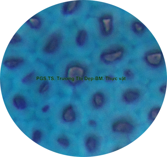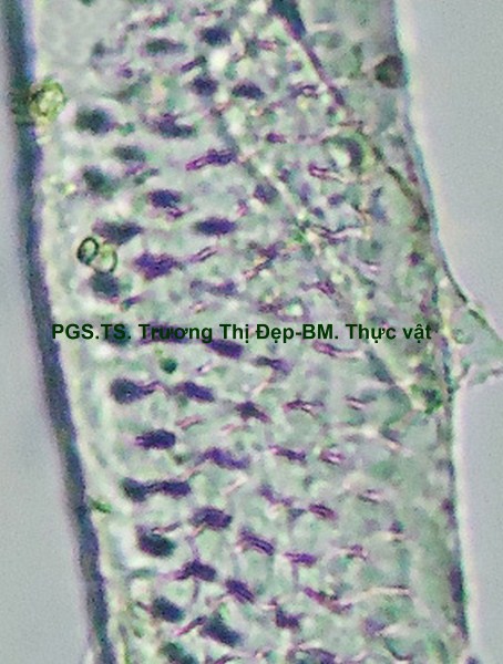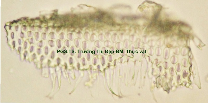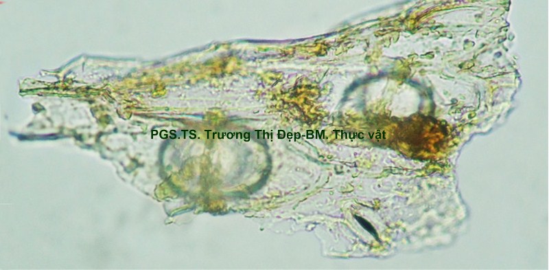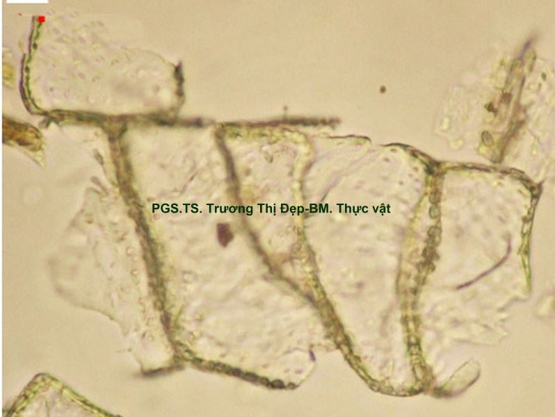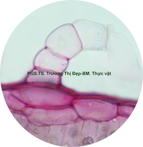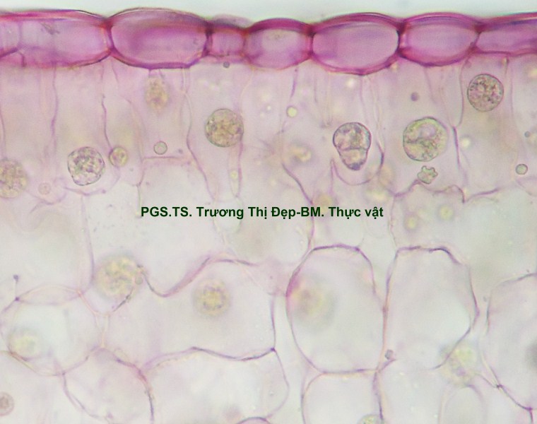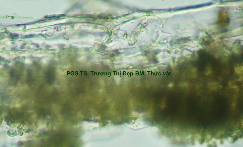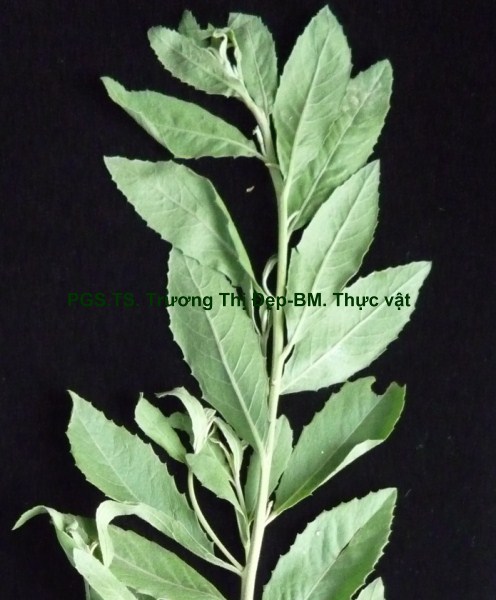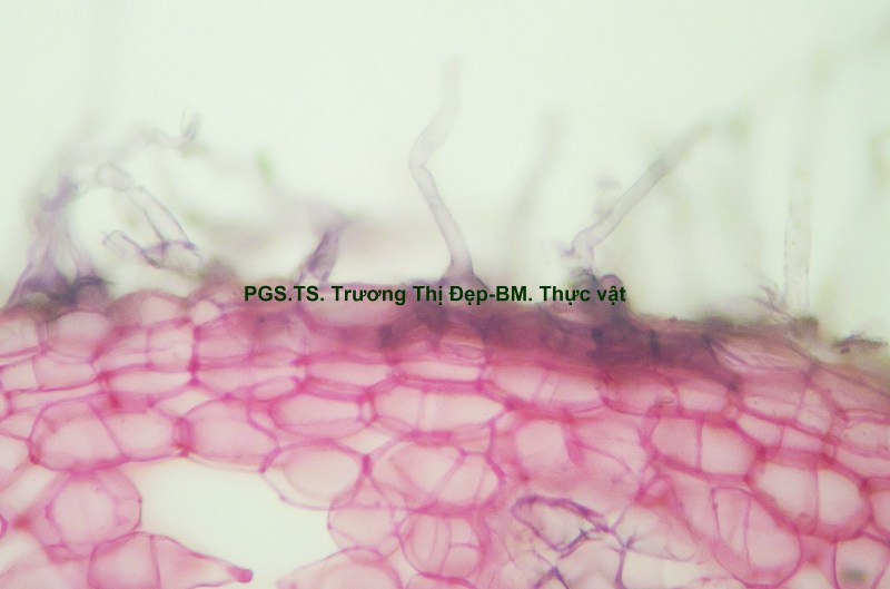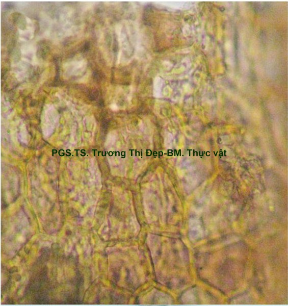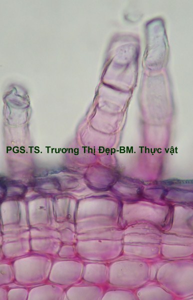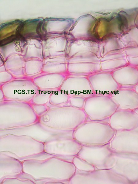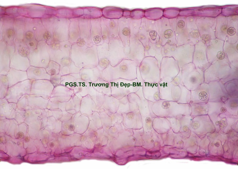 Biểu bì trên tế bào hình bầu dục hoặc đa giác, kích thước không đều. Biểu bì dưới tế bào nhỏ hơn biểu bì trên. Ở cả hai biểu bì có lỗ khí, nhiều lông che chở đa bào bị gãy rụng và lông tiết đa bào như ở thân. Mô mềm giậu 1 lớp dưới biểu bì trên và 1 lớp trên biểu bì dưới, tế bào hình chữ nhật, kích thước bằng hoặc dài hơn tế bào biểu bì. Đi vào gân giữa nối tiếp với mô mềm giậu là mô mềm khuyết chứa lục lạp ăn sâu vào gân giữa, 2-5 lớp tế bào đa giác vách hơi uốn lượn, kích thước không đều. Mô mềm khuyết gồm 4-6 lớp tế bào đa giác, kích thước gần đều, chứa lục lạp, chừa khuyết không đều, lớp sát biểu bì dưới tế bào hình chữ nhật hay đa giác dài có vách lượn xếp gần thẳng góc với biểu bì dưới. Bó gân phụ nằm rải rác gồm gỗ ở trên, libe ở dưới.