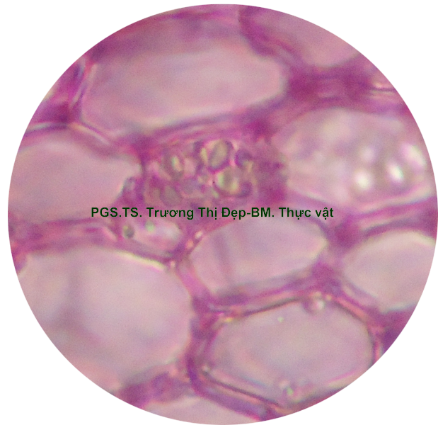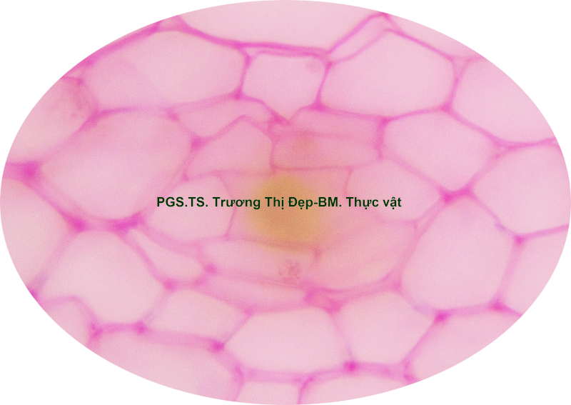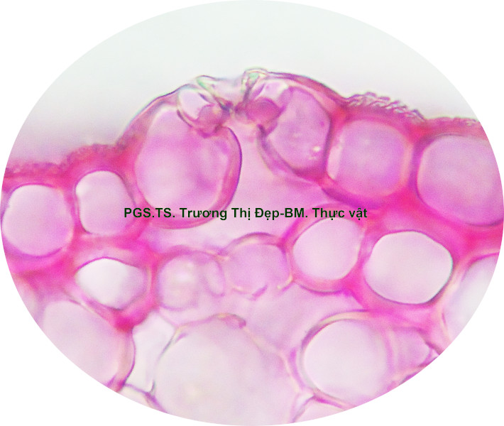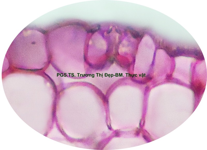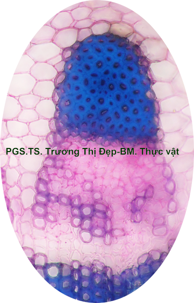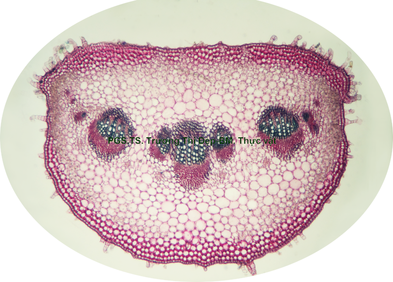 Vi phẫu mặt trên phẳng hoặc hơi lõm, cong lồi ở mặt dưới. Biểu bì tế bào hình vuông hay chữ nhật không đều, lớp cutin răng cưa. Ở cả hai biểu bì có lỗ khí, lông che chở đa bào và lông tiết đa bào như ở thân. Mô dày góc 1-4 lớp không liên tục dưới biểu bì trên, 1-3 lớp trên biểu bì dưới, tế bào đa giác, không đều. Mô mềm khuyết chứa lục lạp ở sát dưới mô dày trên và hai bên biểu bì dưới, 2-4 lớp tế bào nhỏ hình gần tròn, không đều, xếp chừa khuyết vừa. Mô mềm đạo tế bào đa giác hay gần tròn, to, không đều. Mô dẫn: gỗ trên libe, 5-7 bó chính gần như xếp trên một hàng ngang và 2-4 bó phụ nhỏ hơn ở 2 bên phía trên; libe tế bào nhỏ, hình đa giác, xếp lộn xộn thành từng đám xen kẽ các tế bào mô mềm đa giác vách dày cellulose. Mạch gỗ hình tròn hoặc đa giác gần tròn, mỗi bó lớn có 3-8 dãy gỗ, mỗi dãy 2-7 mạch không đều, xen kẽ với 1-2 dãy mô mềm. Mô dày góc 3-10 lớp tế bào hình đa giác dưới libe, hóa mô cứng dần; trên gỗ là 1-4 lớp tế bào mô cứng hình đa giác. Túi tiết ly bào thường ở cạnh bó libe gỗ.