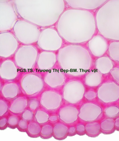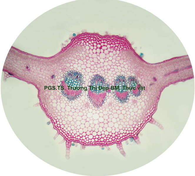 Mặt trên hơi lồi, mặt dưới lồi nhiều. Biểu bì trên tế bào hình đa giác hay gần tròn, không đều, lớp cutin răng cưa. Biểu bì dưới tế bào có kích thước nhỏ hơn hay gần bằng biểu bì trên. Trên biểu bì có lỗ khí rải rác, nhiều lông che chở đa bào và lông tiết đa bào như ở thân. Mô dày góc 3-5 lớp tế bào dưới biểu bì trên, 1-4 lớp tế bào trên biểu bì dưới, tế bào hình đa giác kích thước không đều. Mô mềm khuyết ở hai bên, cạnh lớp mô dày trên và dưới, ít tế bào hình đa giác hay gần tròn, vách hơi lượn xếp chừa khuyết vừa, chứa lục lạp. Mô mềm đạo tế bào hình tròn hoặc đa giác gần tròn, kích thước lớn, không đều. Mô dẫn phân bố gỗ trên libe, gồm 3-4 bó lớn ở giữa và 1-2 bó nhỏ ở hai bên phía trên. Cấu trúc của bó libe và gỗ tương tự như bó của cuống lá nhưng nhỏ hơn. Túi tiết ly bào thường ở cạnh bó libe-gỗ.