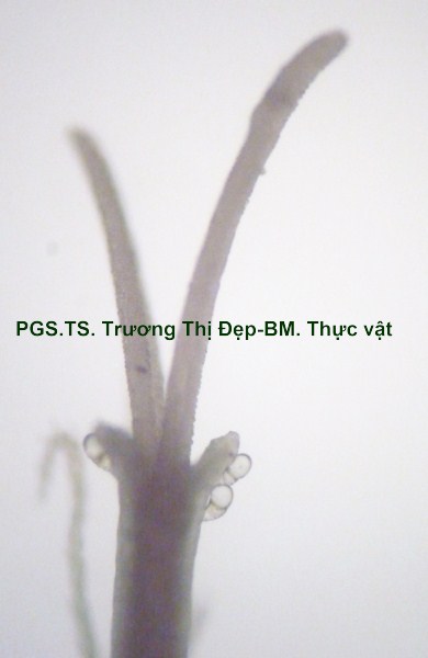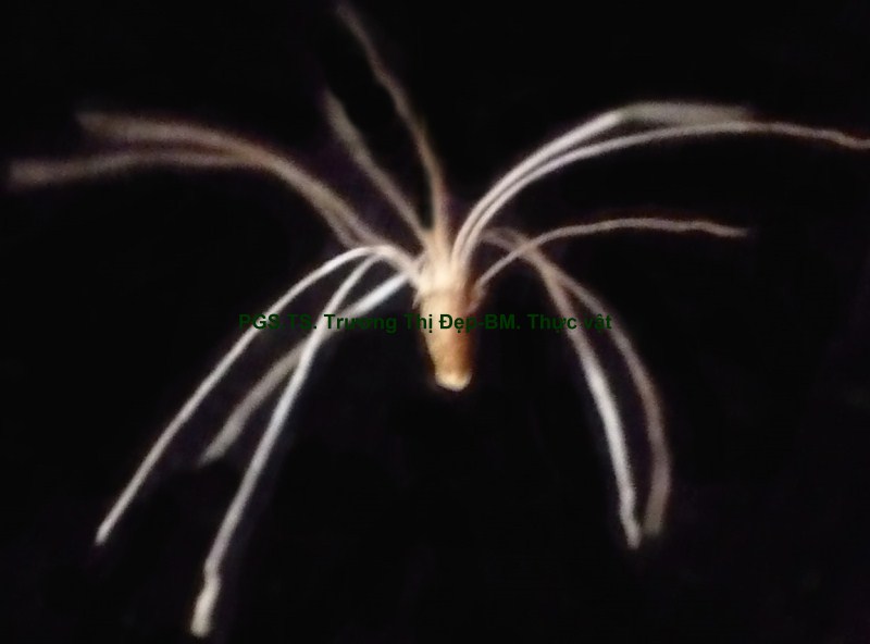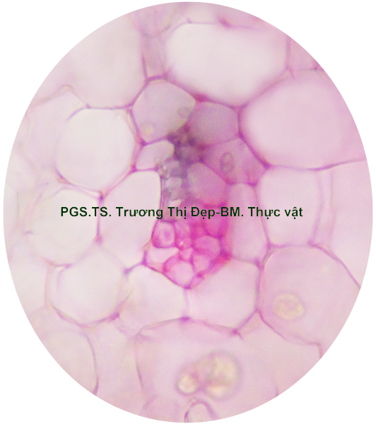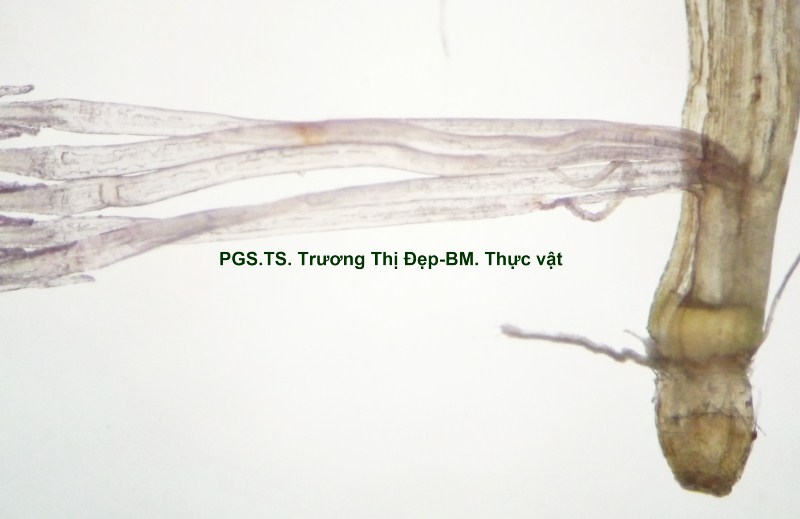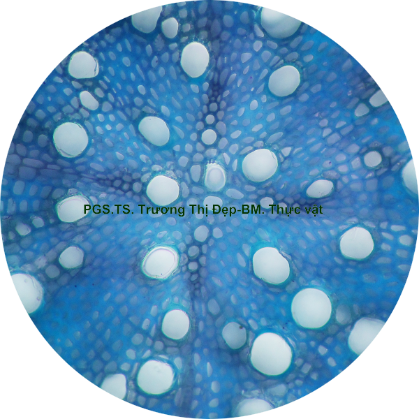 Vi phẫu hình tròn. Các mô gồm: Vết tích tầng lông hút còn thấy một vài lông hút. Bần vài lớp tế bào hình chữ nhật, xếp xuyên tâm, bong tróc. Lục bì vài lớp tế bào hình chữ nhật vách hơi lượn, xếp xuyên tâm với bần. Mô mềm vỏ khuyết, tế bào hình bầu dục nằm ngang hoặc đa giác, kích thước lớn, không đều, vách mỏng, chừa khuyết rộng. Nội bì khung Caspary. Trụ bì 1-2 lớp tế bào to, không đều, vách cellulose. Mô mềm đạo dưới trụ bì tế bào đa giác hoặc gần tròn. Tia tủy rộng gồm 2-5 dãy tế bào hình đa giác xếp theo hướng xuyên tâm. Libe 1 ít, tế bào hình đa giác, kích thước rất nhỏ, xếp lộn xộn, phía trên libe 2. Libe 2 tế bào vách mỏng, xếp xuyên tâm thành nhiều lớp tạo thành nhiều chùy không đều, nhiều tế bào hóa mô cứng hay vách cellulose dày xếp riêng rẽ hoặc tụ thành đám xen kẽ với mô mềm libe. Gỗ 2 chiếm tâm; mạch gỗ 2 hình đa giác, tròn hay bầu dục kích thước to nhỏ, không đều, xếp lộn xộn; mô mềm gỗ 2 tế bào hình đa giác, vách tẩm chất gỗ hay còn cellulose. Gỗ 1 mạch nhỏ hình đa giác gần tròn, xếp 4-5 bó hướng tâm dưới chân tia tủy, mỗi bó 3-5 mạch. Ống tiết ly bào nằm sát hoặc trên nội bì ở vị trí các chùy libe, riêng lẻ hay tập họp 2-6 ống. Tế bào tiết rải rác trong mô mềm vỏ, tia libe và nội bì. Tinh bột ít, rải rác trong tế bào tia libe và nội bì, hạt nhỏ hình tròn dẹp.