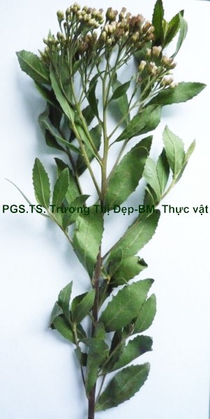 Cây bụi cao 1-3 m, phân nhánh, tiết diện thân tròn, toàn cây có nhiều lông thô nhám và có mùi rất thơm. Thân non màu xanh; thân già màu nâu tía. Lá đơn, mọc cách. Phiến lá hơi dòn dai, hình bầu dục đầu nhọn, đáy phiến men dần xuống cuống, màu xanh lục hơi xám và thô nhám, hai mặt lá gần giống nhau, mép lá có răng cưa nhọn khá cạn và không đều, kích thước 4-9,5 x 2,5-4,5 cm, lá ở cành mang hoa có kích thước khoảng 2-5 x 1-2 cm. Gân lá hình lông chim, nổi rõ ở mặt dưới, 6-9 cặp gân phụ. Cuống lá ngắn khoảng 0,3-0,5 cm hoặc gần như không có, hình trụ hơi dẹt ở hai mặt, màu xanh nhạt, có nhiều lông. Cụm hoa đầu hợp thành dạng ngù ở ngọn cành, chiều dài cụm hoa 5-15 cm. Đầu hình trứng khi là nụ, khi hoa nở hình chuông hơi thắt ở giữa, kích thước 0,5-0,6 x 0,3-0,4 cm; cuống ngắn 0,5-1 cm, lá bắc của đầu dạng vảy nạc nhỏ; tổng bao lá bắc 6-8 hàng xếp kết lợp, vòng trong dài hơn vòng ngoài, màu xanh hơi vàng nâu ở rìa, dạng hình bầu dục hơi khum úp vào trong mặt ngoài nhiều lông trắng nhỏ ở 3-4 vòng ngoài đến dạng dải hẹp thẳng và nhẵn ở 3-4 vòng trong, kích thước 1,5-5 x 0,5-2 mm, thường tồn tại; đế cụm hoa phẳng hơi lõm ở giữa, lỗ tổ ong. Đầu mang hoa hình ống có hai loại hoa: hoa cái rất nhiều xếp trên 4-5 vòng ở ngoài, hoa lưỡng tính 6-10 hoa ở trong. Hoa cái: màu trắng hơi hồng; đài hoa là một chùm lông mào màu trắng bẩn, dài 0,4-0,5 cm, có gai nạc; tràng hoa dính nhau bên dưới thành một ống rất hẹp, dài 0,4-0,5 mm, trên chia làm 2-5 răng tam giác, tiền khai van; lá noãn 2 ở vị trí trước sau tạo thành bầu dưới 1 ô đựng 1 noãn đính đáy; bầu có màu trắng xanh, hình trụ dài khoảng 1 mm, hơi cong ở những hoa ngoài cùng, gốc có khoen đính, mặt ngoài có gờ dọc, ít lông ngắn màu trắng; vòi nhụy màu trắng hồng dạng sợi dài khoảng 0,4 mm, nhẵn; đĩa mật không rõ ở gốc vòi nhụy; 2 đầu nhụy màu trắng ngà, dạng sợi, thò choãi hướng trước sau, lấm tấm gai nạc ngắn. Hoa lưỡng tính: màu hồng nhạt, đài hoa giống hoa bìa; tràng hoa dính nhau bên dưới thành một ống dài khoảng 0,5 cm, hơi thắt ở dưới, phía trên loe, tận cùng chia 5 phiến đều hình bầu dục đỉnh nhọn, có ít lông tiết ngắn, tiền khai van; nhị 5, đều, chỉ nhị màu hồng nhạt, rời, dạng sợi dài khoảng 0,3 cm, đính ở gần gốc ống tràng xen kẽ cánh hoa, bao phấn màu hồng dính nhau thành ống dài khoảng 0,2 cm bao lấy vòi nhụy, 2 buồng, nứt dọc, hướng trong, chung đới dạng phiến bầu dục đỉnh nhọn, gốc có tai tam giác nhọn; hạt phấn màu trắng, hình bầu dục gần cầu, có gai, đường kính 25-30 x 17,5-27,5 µm; bầu giống hoa cái, kích thước ngắn và to hơn; vòi nhụy màu hồng nhạt đậm dần ở trên, dạng sợi, dài 0,4-0,5 cm, có gai nạc ở gần đầu nhụy, đĩa mật rõ quanh gốc vòi; 2 đầu nhụy màu hồng nhạt, dạng máng hẹp. Quả bế màu nâu nhạt, hình trụ khoảng 1 mm, có túm lông mào của đài tồn tại, mặt ngoài vỏ quả có dọc lồi, có lông ngắn và tuyến rất nhỏ.