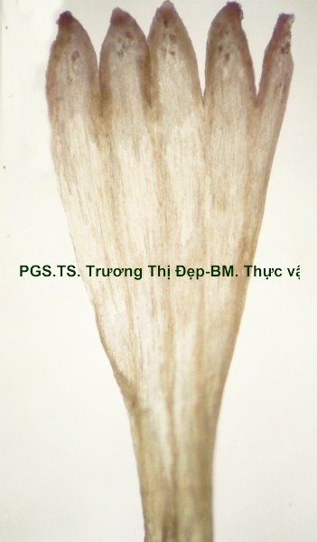 Rễ: Bột rễ màu vàng nâu. Soi dưới kính hiển vi thấy: Mảnh bần màu nâu, tế bào đa giác vách dày. Mảnh mô mềm. Mảnh mô mềm có ống tiết, chất tiết màu vàng nâu. Mảnh mạch vạch, mạch mạng, mạch điểm. Sợi.