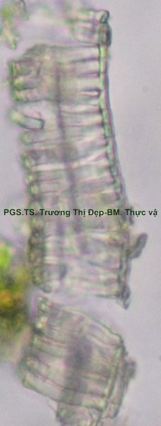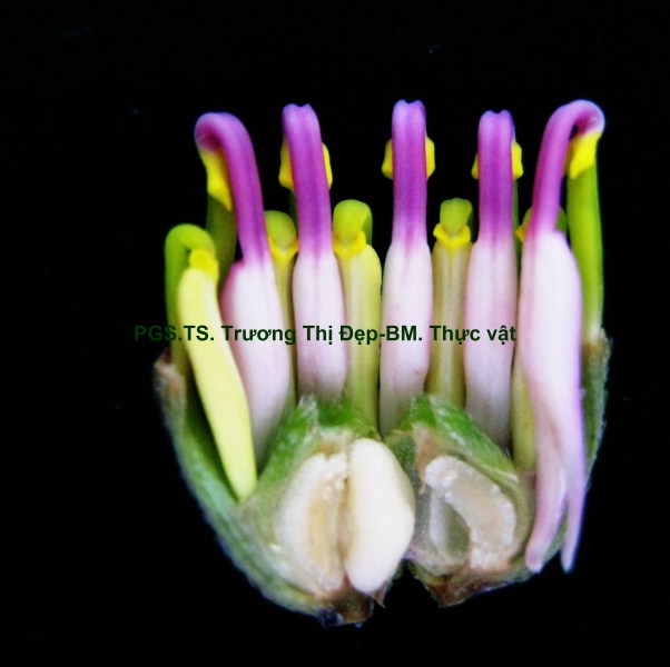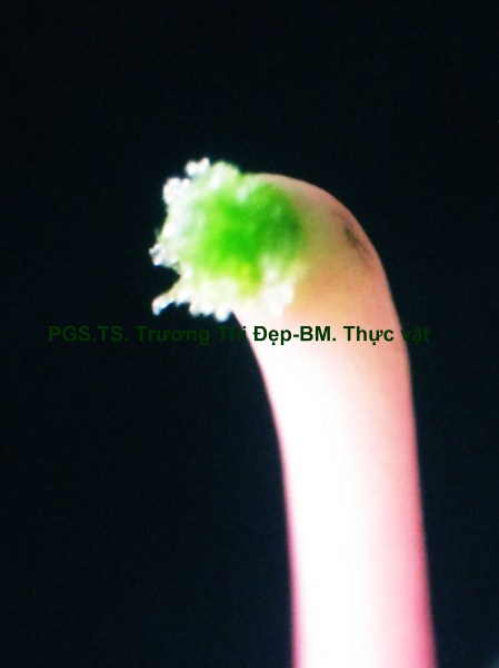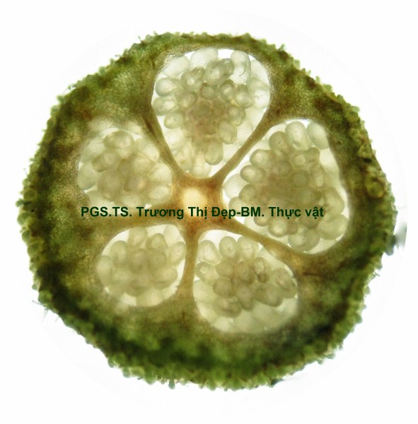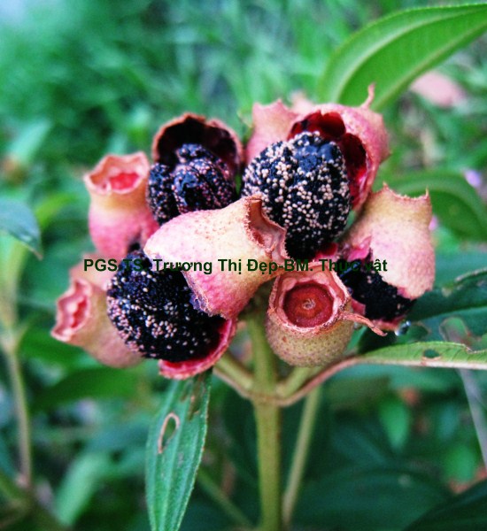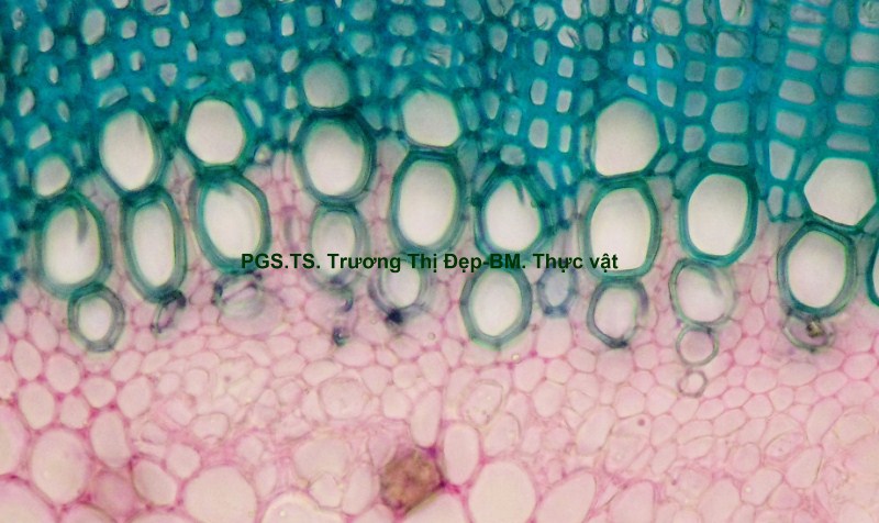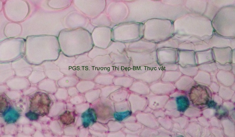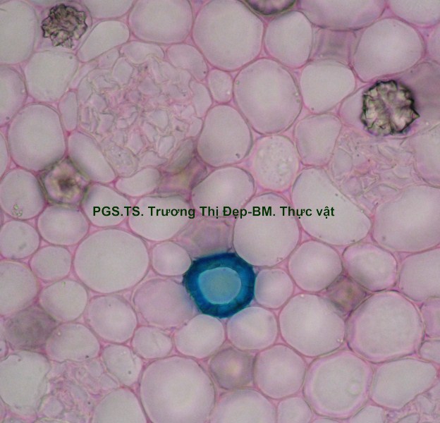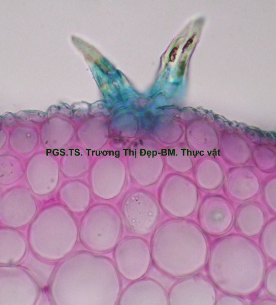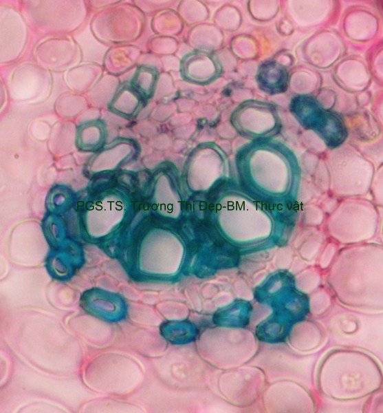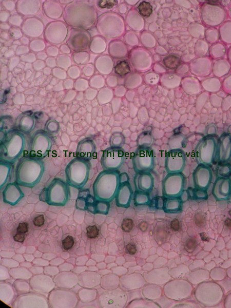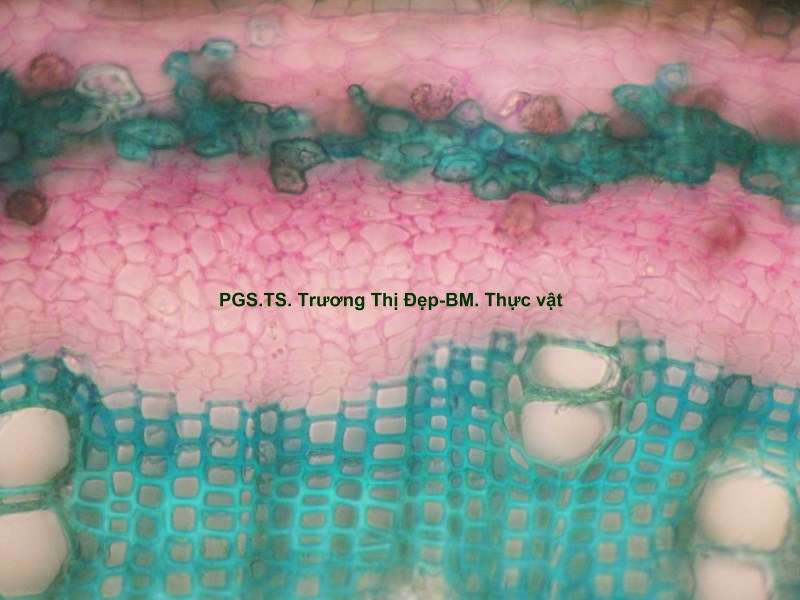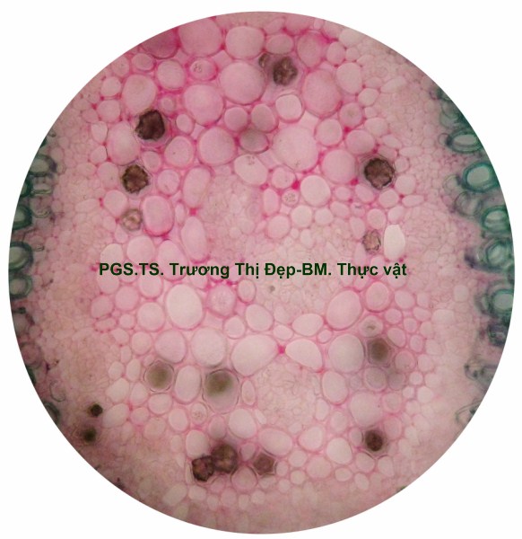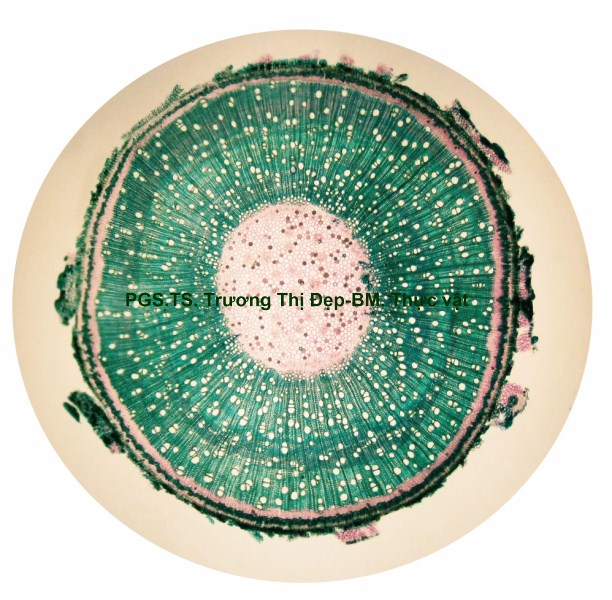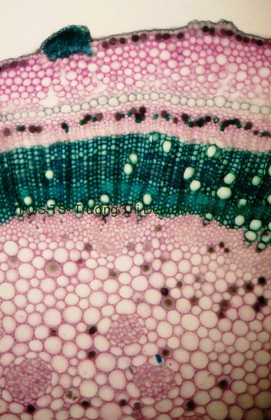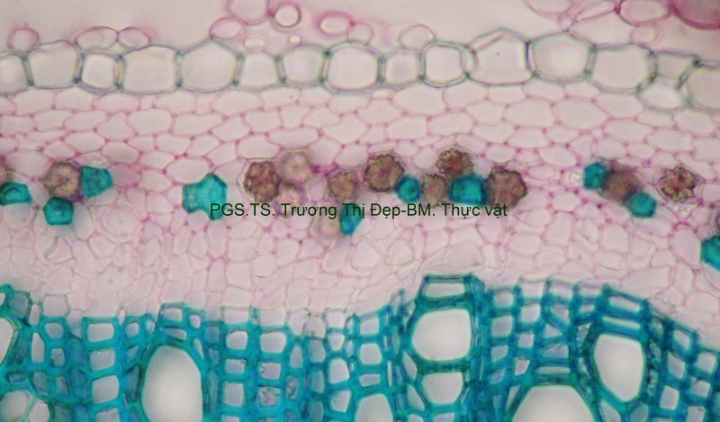 Thân Vi phẫu thân non hình chữ nhật hơi lồi ở 4 góc. Các mô gồm: Biểu bì, 1 lớp tế bào hình đa giác, kích thước không đều, lớp cutin dày có răng cưa, có nhiều lông che chở đa bào (gồm nhiều tế bào dính với nhau giống như vẩy tam giác). Mô dày góc bị gián đoạn ở 4 góc lồi, 3-4 lớp tế bào đa giác tròn, kích thước không đều; lớp tế bào sát dưới biểu bì thường chứa tinh thể calci oxalat hình cầu gai to. Ở góc lồi, dưới biểu bì là mô mềm khuyết 2-3 lớp tế bào hình đa giác, kích thước không đều, xếp lộn xộn, chứa nhiều lục lạp; bó dẫn gồm gỗ ở trên libe ở dưới; 6-8 mạch gỗ hình đa giác, kích thước không đều; mô mềm gỗ, tế bào hình đa giác nhỏ, vách cellulose hay tẩm chất gỗ; libe, 2-3 lớp tế bào hình đa giác nhỏ, vách uốn lượn; vòng mô cứng không liên tục bao quanh bó dẫn. Cụm sợi 3-5 lớp tế bào hình đa giác to hay nhỏ vách dày hay mỏng, thường xếp thành cụm dưới chân lông che chở. Mô mềm khuyết, 3-4 lớp, tế bào hình tròn, càng vào trong kích thước càng nhỏ dần. Nội bì khung Caspary, tế bào hình chữ nhật hoặc đa giác góc tròn, kích thước khá to. Tầng bì sinh xuất hiện sát dưới nội bì. Trụ bì 4-6 lớp tế bào đa giác, kích thước không đều, 1-2 lớp sát libe hóa sợi thành nhiều cụm nhỏ 1-5 tế bào, phân bố đều thành vòng, xen lẫn vùng sợi trụ bì có nhiều tế bào chứa tinh thể calci oxalat hình cầu gai to chiếm gần hết thể tích tế bào. Vi phẫu thân già hình tròn. Bần 4-6 lớp, tế bào hình chữ nhật xếp xuyên tâm. Lục bì 1-2 lớp, tế bào hình chữ nhật vách cellulose, xếp xuyên tâm lớp bần. Trụ bì 6-8 lớp tế bào kích thước không đều; 3-4 lớp trên, tế bào vách cellulose hình bầu dục dẹp; 4-5 lớp dưới hóa sợi vách dày hay mỏng ống trao đổi rõ, gần như tạo thành vòng. Hệ thống dẫn kiểu hậu thể liên tục, vùng gỗ lớn gấp 14-15 lần vùng libe. Libe 1 gồm 4-5 lớp tế bào hình đa giác, vách uốn lượn, xếp thành cụm sát trụ bì; libe 2 tế bào hình chữ nhật hay hình đa giác. Gỗ 2 nhiều, mạch gỗ hình đa giác, kích thước không đều, phân bố đều trong vùng mô mềm gỗ 2; mô mềm gỗ không bao quanh mạch, tế bào hình chữ nhật hoặc đa giác, vách tẩm chất gỗ thẳng hay uốn lượn, xếp xuyên tâm rõ. Gỗ 1 xếp thành nhiều cụm không đều, mỗi bó 2-4 mạch hình đa giác tròn; mô mềm gỗ 1 tế bào hình đa giác nhỏ vách cellulose. Tia tủy hẹp 1-2 dãy tế bào thuôn dài. Libe trong, tế bào hình đa giác, vách uốn lượn, xếp thành cụm dưới gỗ 1 và nhiều cụm tròn lộn xộn trong vùng tủy. Mô mềm tủy đạo, tế bào hình bầu dục hoặc tròn, rải rác có tế bào hóa mô cứng, kích thước nhỏ, vách dày ống trao đổi rõ. Tinh thể calci oxalat hình cầu gai có nhiều trong mô mềm tủy, trụ bì và libe sát trụ bì. Cuống lá