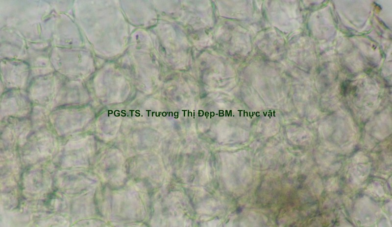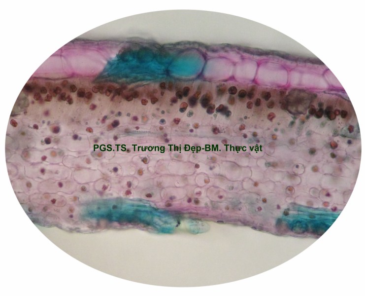 Biểu bì trên tế bào hình đa giác nhỏ, bị ép dẹp; biểu bì dưới tế bào hình chữ nhật lớn hơn biểu bì trên, có nhiều lỗ khí; có lông che chở ở hai mặt. Hạ bì, 1-3 lớp tế bào mô dày góc, hình đa giác góc tròn hay bầu dục ngang, kích thước không đều, lớp đầu tiên kích thước nhỏ, từ lớp thứ 2 kích thước rất to, không đều nhau. Mô giậu 1 lớp tế bào hình đa giác thuôn dài, chứa nhiều lục lạp, dưới 1 tế bào hạ bì có 2-5 tế bào mô mềm giậu. Mô mềm khuyết, hình dạng và kích thước tế bào thay đổi, chứa nhiều calci oxalat hình cầu gai.