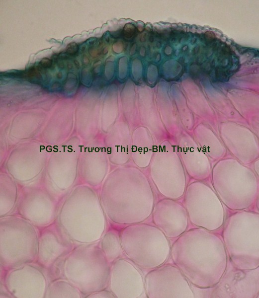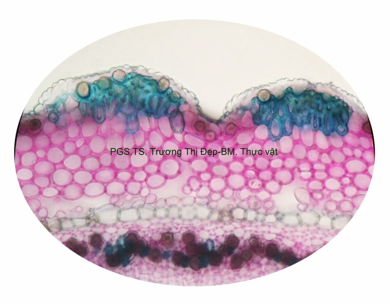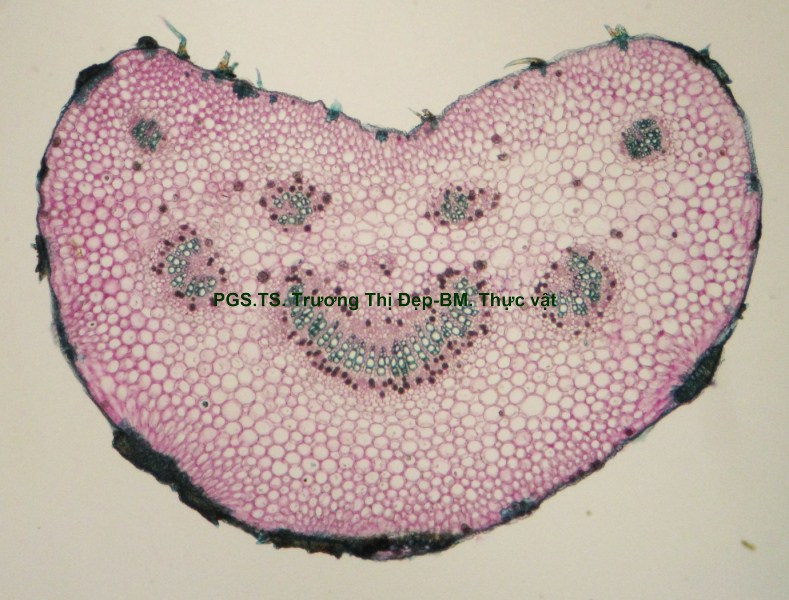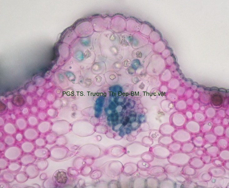 Vi phẫu lồi tròn mặt dưới, mặt trên rất hẹp. Biểu bì gồm 1 lớp tế bào hình bầu dục dẹp, kích thước không đều, lớp cutin dày răng cưa, lông che chở đa bào cấu tạo giống lông của thân. Mô dày góc, 3-5 lớp tế bào hình bầu dục hoặc tròn, kích thước lớn hơn tế bào biểu bì; lớp tế bào sát biểu bì thường to và chứa nhiều tinh thể calci oxalat hình cầu gai. Cụm sợi 3-5 lớp tế bào hình đa giác to hay nhỏ vách dày hay mỏng, thường xếp thành cụm dưới chân lông che chở. Mô mềm đạo, 4-5 lớp tế bào hình bầu dục. Hệ thống dẫn gồm libe ở dưới gỗ ở trên xếp thành hình cung; mạch gỗ tế bào hình đa giác xếp thành dãy, mô mềm gỗ hình đa giác vách cellulose; libe tế bào hình đa giác, kích thước không đều xếp thành vòng liên tục. Mô mềm đặc tế bào hình đa giác, kích thước nhỏ, xếp thành cung bao quanh cung libe. Libe trong xếp thành nhiều cụm nhỏ ngay dưới gỗ và 2-3 cụm tròn trong vùng mô mềm tủy. Mô mềm tủy đạo, tế bào hình bầu dục, kích thước to, rải rác có vài tế bào kích thước nhỏ hóa mô cứng vách dày, ống trao đổi rõ. Tinh thể calci oxalat hình cầu gai nhiều trong vùng libe và mô mềm tủy. Phiến lá