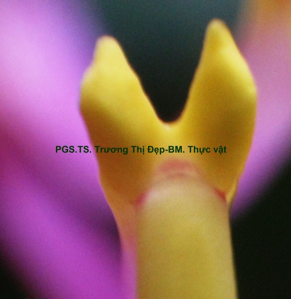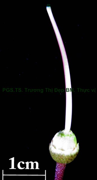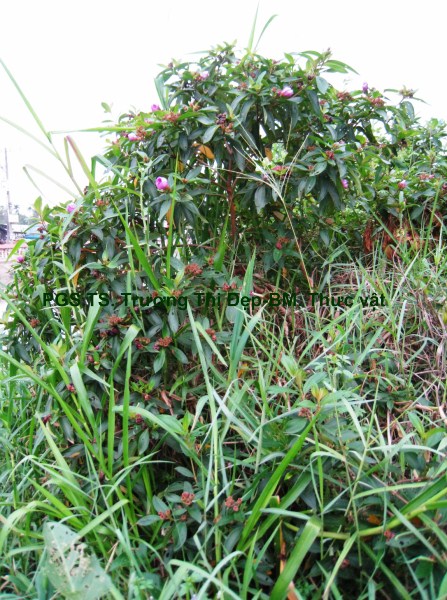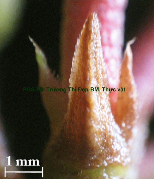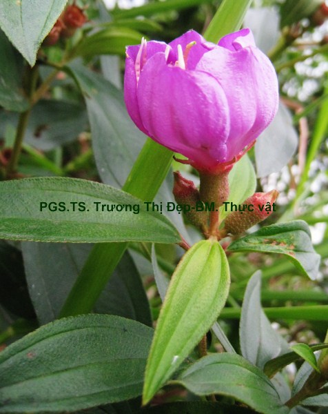 Cây bụi cao 1-2 m. Thân non màu nâu đỏ, tiết diện vuông có 4 gờ, nhiều lông cứng dạng vẩy màu hồng mọc áp sát; thân già màu nâu, tiết diện tròn, có các đường nứt chạy dài và lớp vỏ bong ra. Lá đơn, mọc đối. Phiến lá hình xoan, gốc tròn hơi lệch, ngọn lá có mũi nhọn, dài 8,5-10 cm, rộng 4-4,5 cm, 2 mặt phủ lông cứng ngắn nhiều hơn ở mặt dưới, mặt trên màu xanh đậm hơn mặt dưới; bìa phiến nguyên có nhiều lông cứng. Hệ gân lá 5 gân chính hình cung có rất nhiều lông cứng, chỉ có gân giữa và cặp gân bên thứ 2 nổi rõ mặt dưới hằn mặt trên; cặp gân bên thứ nhất xuất phát từ gốc, cách bìa phiến 0,1-0,2 cm chạy dọc tới ngọn; cặp gân bên thứ hai từ xuất phát gốc, cách bìa 0,7-0,8 cm chạy tới ngọn; 30-40 cặp gân phụ gặp nhau ở gân bên tạo thành hình mắt lưới. Cuống lá có rãnh hình lòng máng, màu vàng nâu, mang nhiều lông cứng, dài 0,8-1 cm. Lá không có lá kèm. Cụm hoa xim 2 ngả mang 2-8 hoa ở nách lá gần ngọn cành hay ở ngọn cành. Cuống cụm hoa màu nâu đỏ, mang nhiều lông cứng, tiết diện hình chữ nhật. Hoa đều, lưỡng tính, thường gặp mẫu 5 ít khi mẫu 4. Cuống hoa hình trụ, màu nâu đỏ, có lông cứng, dài 1,5-2 cm. Lá bắc và lá bắc con: Lá bắc dạng vẩy hình tam giác đỉnh có gai nhọn, dài 3,4-4 mm, màu nâu đỏ, nhiều lông cứng ở bìa, rụng sớm. Lá bắc con 2 vẩy tam giác nhọn, màu nâu đỏ dài 2,5-3 mm, nhiều lông. Lá đài 5, đều, màu nâu tía, có nhiều lông cứng mặt ngoài, dính nhau phía dưới thành ống hình chén dài 0,4-0,5 cm, phía trên chia thành 5 thùy hình tam giác dài 6-8 mm, xen kẽ 5 thùy đài là 5 vẩy tam giác nhỏ; tiền khai van. Cánh hoa 5, đều, rời, đính trên ống đài, dễ rụng, màu hồng tím mặt trên đậm hơn mặt dưới, phiến hình trứng ngược có nhiều gân, dài 2,4-2,6 cm, rộng 1,4-1,6 cm, móng hẹp dài 0,4-0,5 cm, mặt trên có lông mịn mặt dưới nhẵn bóng, rìa có nhiều lông; tiền khai vặn. Bộ nhị gồm 10 nhị rời, không đều, đính trên 2 vòng, chỉ nhị gập trong nụ hoa; khi hoa nở 5 bao phấn của nhị dài ở phía sau, 5 bao phấn của nhị ngắn ở giữa. 5 nhị vòng ngoài, chỉ nhị dạng sợi dẹt dài 3,3-3,6 cm có đốt chia 2 đoạn gần bằng nhau: đoạn phía trên cong màu hồng, đoạn phía dưới thẳng màu vàng, ở đốt có phụ bộ là 2 khối hình tam giác nhỏ màu vàng; bao phấn 2 ô uốn lượn, dài 1,1-1,2 cm, màu hồng, chung đới rộng, mở bằng 1 lỗ ở đỉnh. 5 nhị vòng trong ngắn, chỉ nhị màu vàng, dài 1,1-1,2 cm, có đốt ở gần đỉnh; bao phấn dài 1-1,2 cm, màu vàng, hình dạng giống bao phấn vòng nhị ngoài nhưng đáy có phụ bộ là có 2 khối tam giác nhỏ màu vàng. Hạt phấn hình chữ nhật góc tròn, có rãnh dọc, màu vàng, dài 26-30 µm, rộng 13-16 µm. Bộ nhụy: 4-5 lá noãn dính nhau, bầu giữa 5 ô; mỗi ô nhiều noãn, đính noãn trung trụ; bầu hình trứng dài 0,5-0,7 cm, rộng 0,6-0,7 cm, màu xanh trắng có nhiều lông cứng; vòi nhụy hình trụ mảnh cong ở đỉnh, dài 2,8-3 cm, màu hồng nhạt, nhẵn; đầu nhụy dạng điểm, màu xanh. Quả mọng, hình chuông dài 1-1,2 cm, rộng 0,7-0,8 cm, màu nâu tím, mang đài tồn tại, bề mặt có nhiều lông cứng áp sát; khi chín mở bằng 1 đường nứt không cố định.